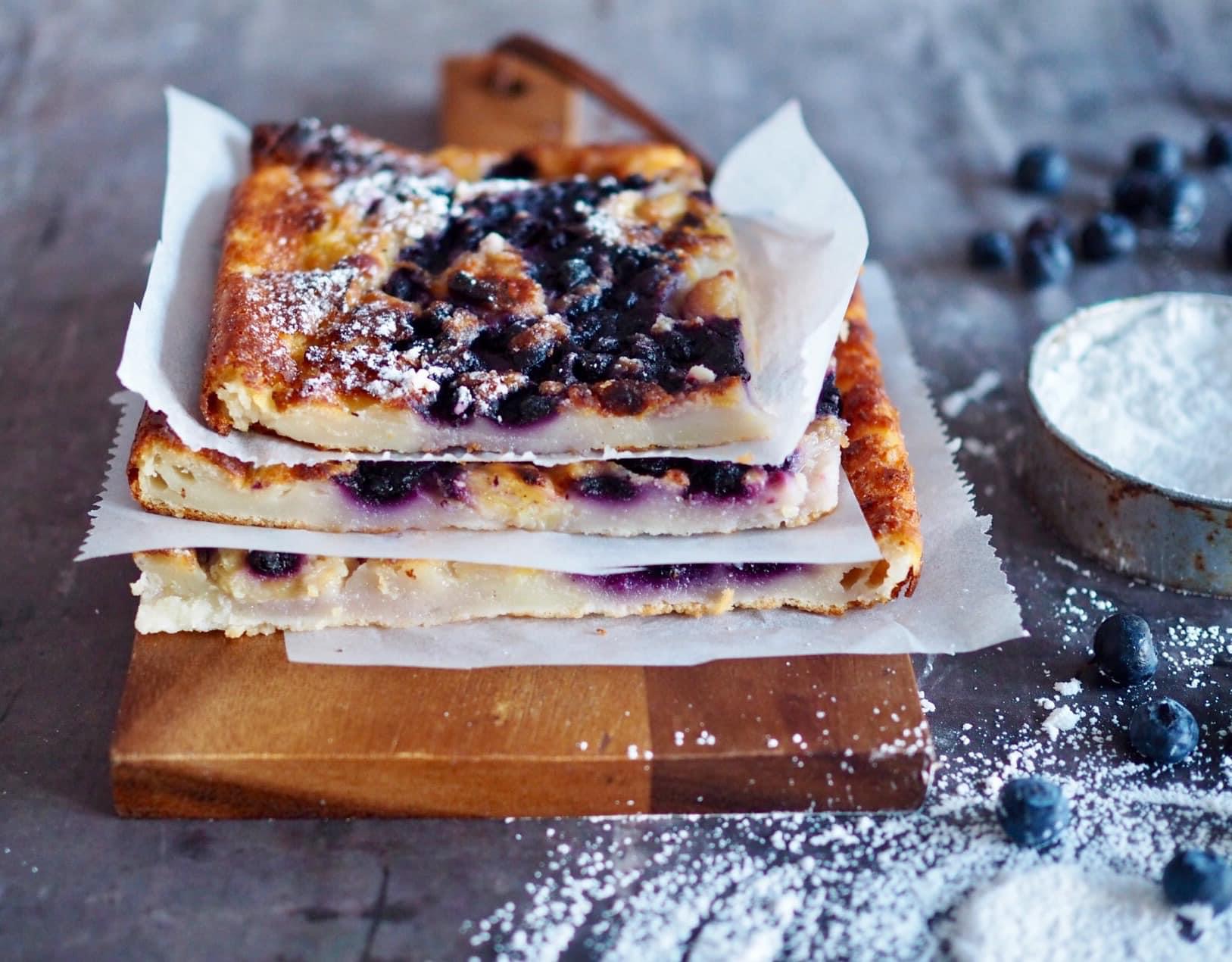 Kaada taikina leivinpaperille uunipellille. Viipaloi päälle banaanit ja ripottele pakastemustikat.