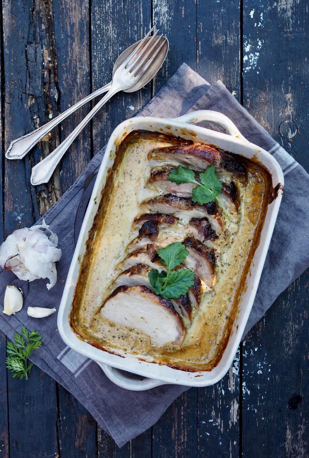 Lisää pannulle kerma, loput marinadista ja yrttiseoksesta. Kiehauta. Kaada kastike fileen ympärille uunivuokaan ja kypsennä fileetä 175-asteisessa uunissa noin 25 minuuttia.