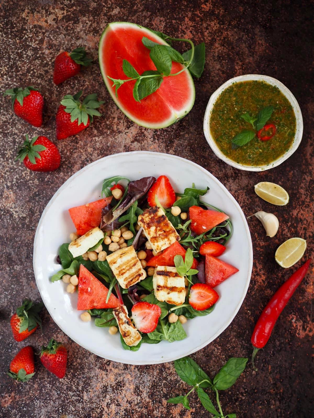 Grillaa tai pariloi halloumiviipaleita öljytyllä pannulla, kunnes halloumi saa kauniin värin. Nosta viipaleet salaatin päälle. Nauti heti.