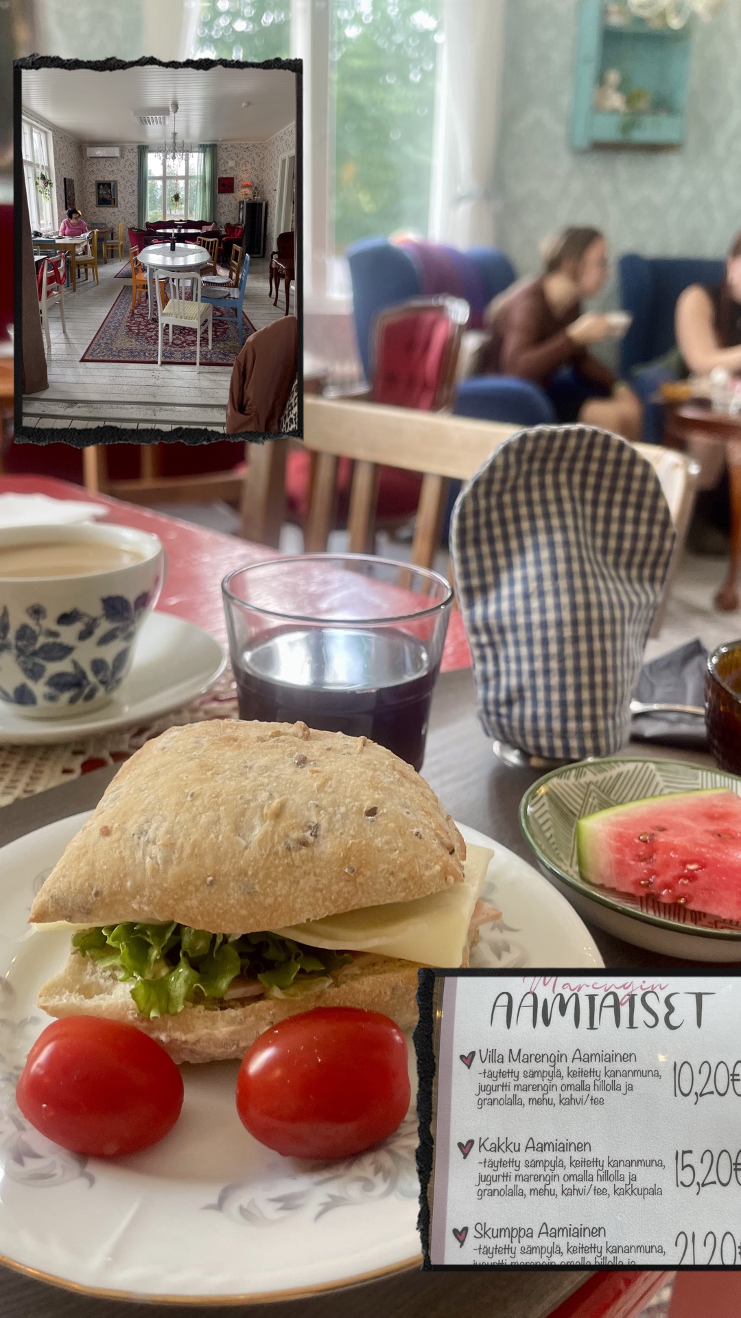 Koska kumpikaan ei ollut syönyt aamiaista, ensimmäinen pysähdys oli Hämeenlinnan Villa Marenki. Halusin esitellä kahvilan ystävälleni, joka ei ollut käynyt siellä aikaisemmin.