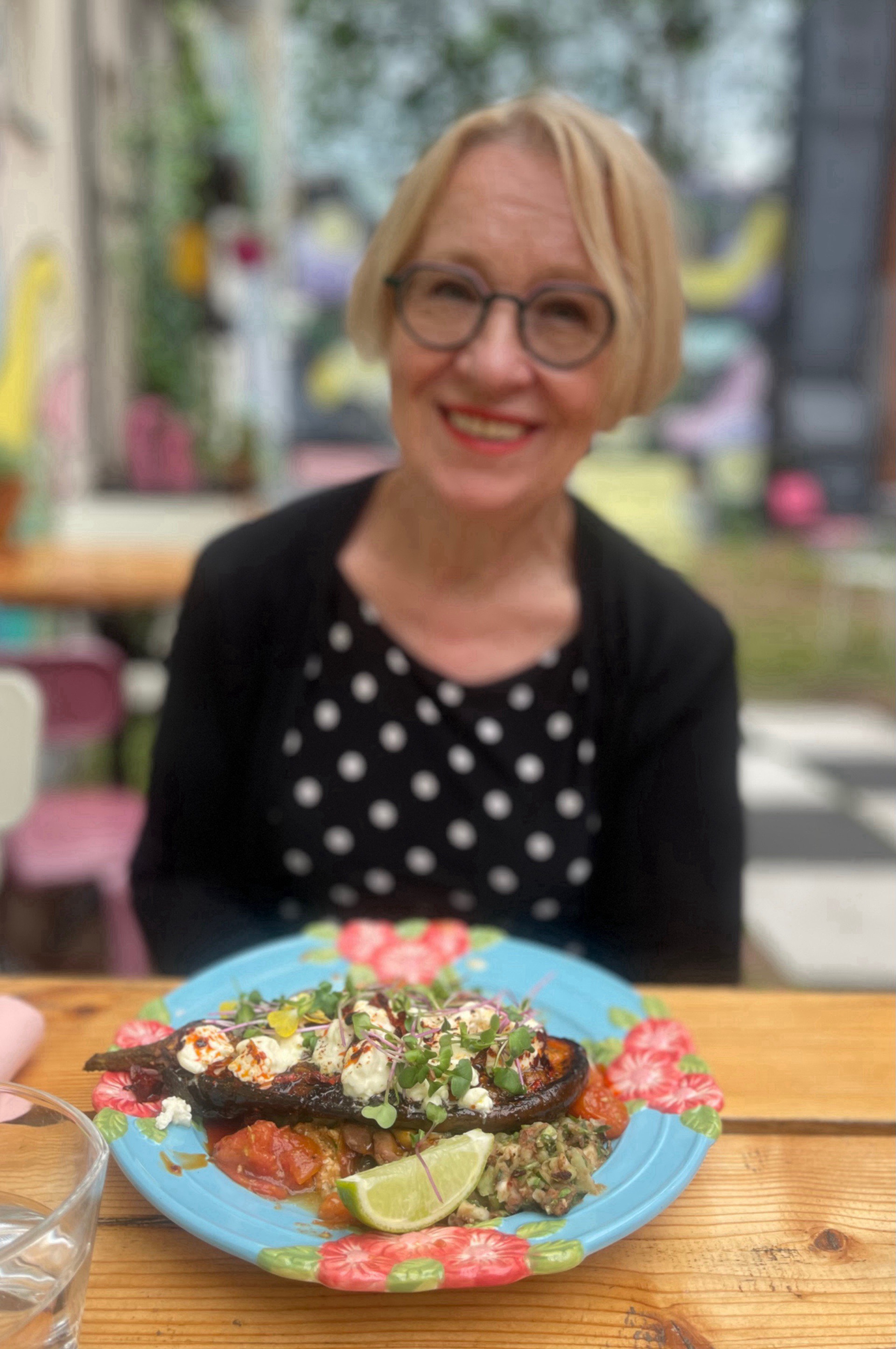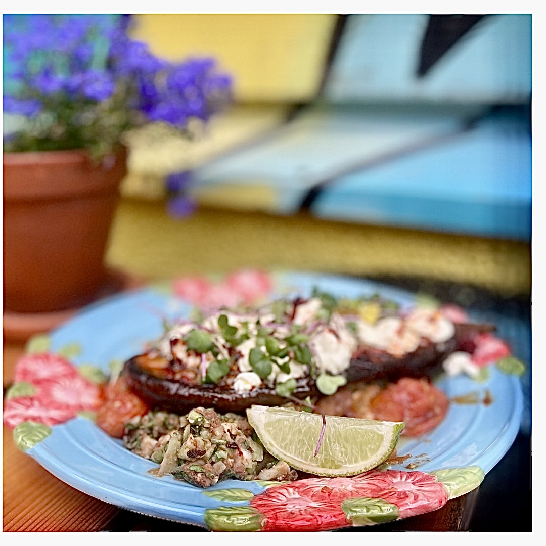 Puutarhassa tarjolla oleva Ravintola Muusan menu on yhdistelmä rentoja herkkuja ja värikkäitä pääruokia. Unelmaravintola myös kasvissyöjille! Minulla iski paha annoskateus Kaisan munakoisoannokseen.