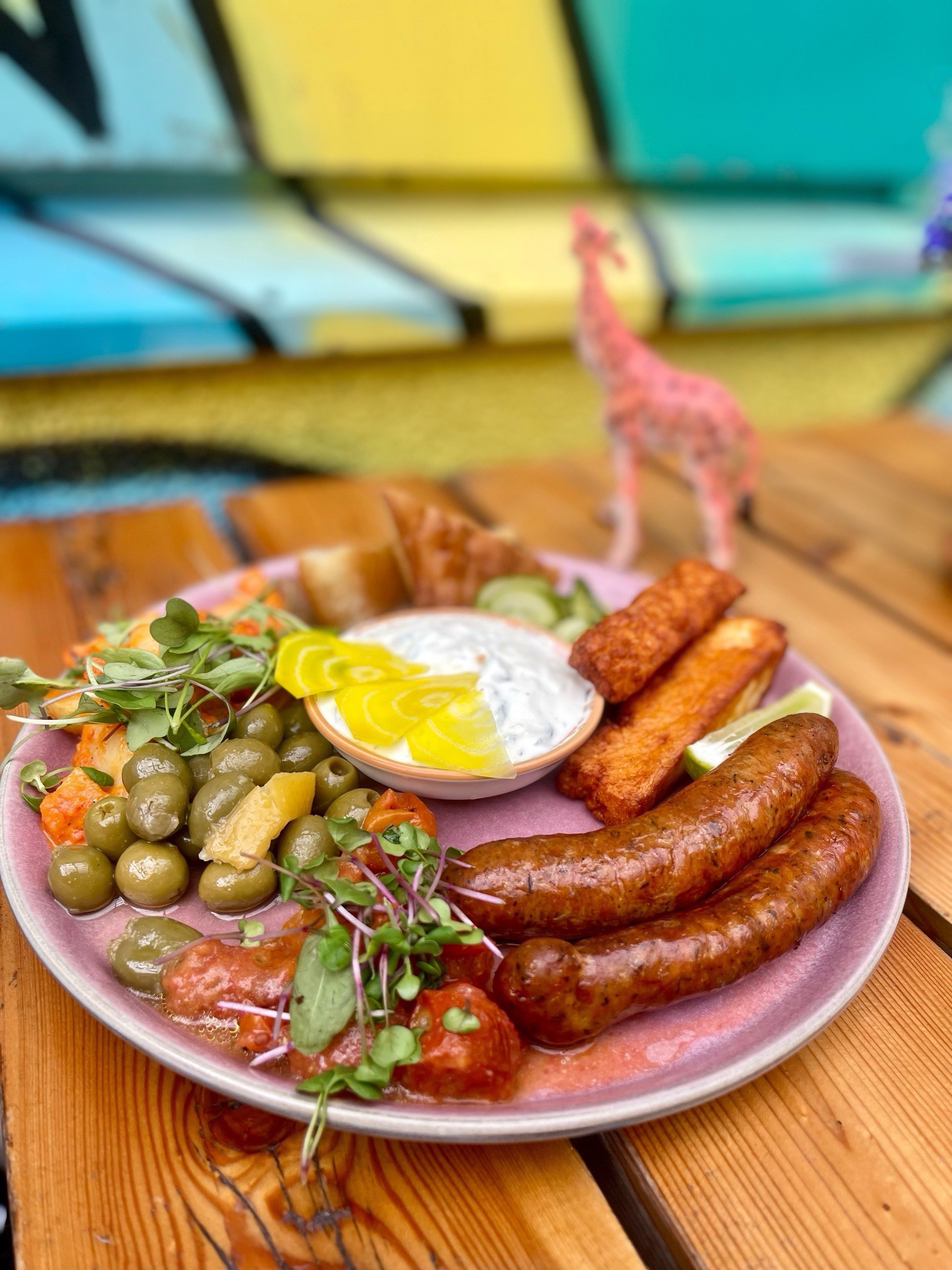 LIHA 24 € Nakki Hannun nakkeja, halloumia, nokkos-hummusta, tsatsikia, marinoituja oliveja, paahdettua tomaattia, mojo-perunasalaattia, hölsky kurkkua & Muusan focacciaa.