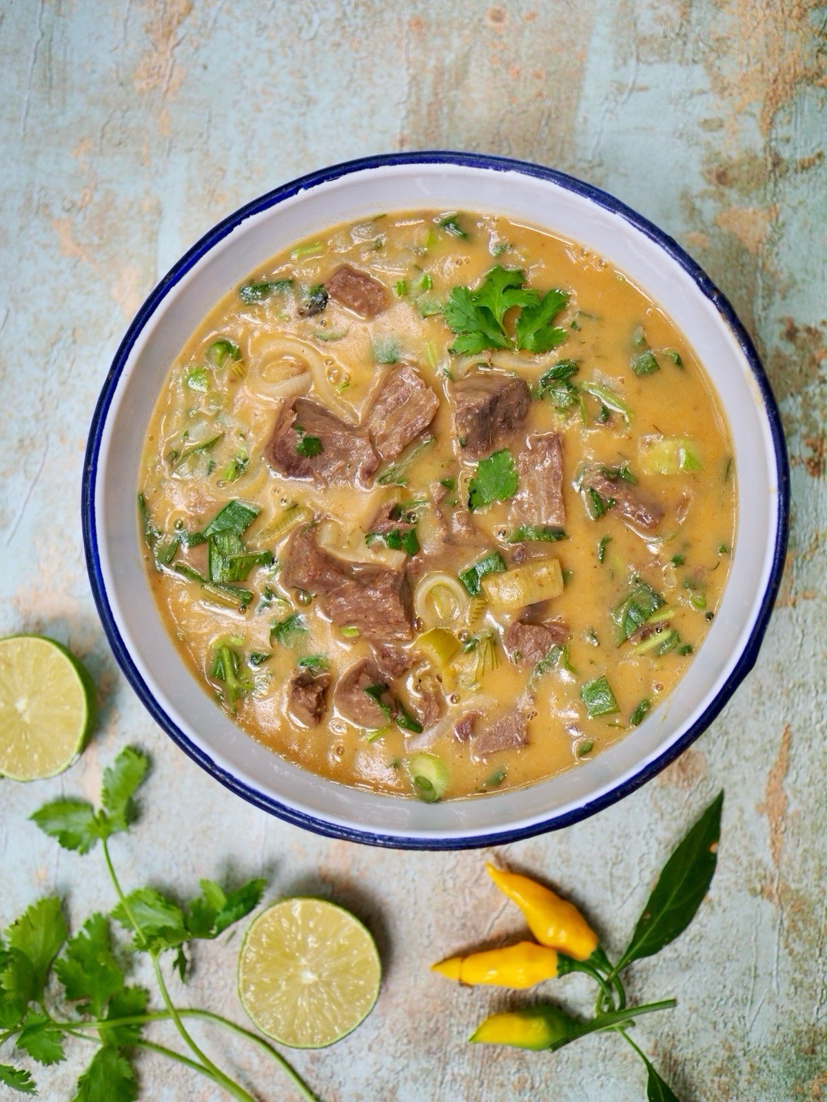 Sulata voi kattilassa ja lisää rasvan joukkoon currytahna ja sipulit kuulottumaan. Lisää vehnäjauhot ja sekoita hyvin. Lisää kuumaa keitinlientä vähitellen, koko ajan sekoittaen kunnes kastike sakenee. Anna kastikkeen kypsyä miedolla lämmöllä vartin verran. Mausta kastike sokerilla, limettimehulla ja korianterilla. Lorauta kastikkeeseen kookoskerma. Tarkista suola.