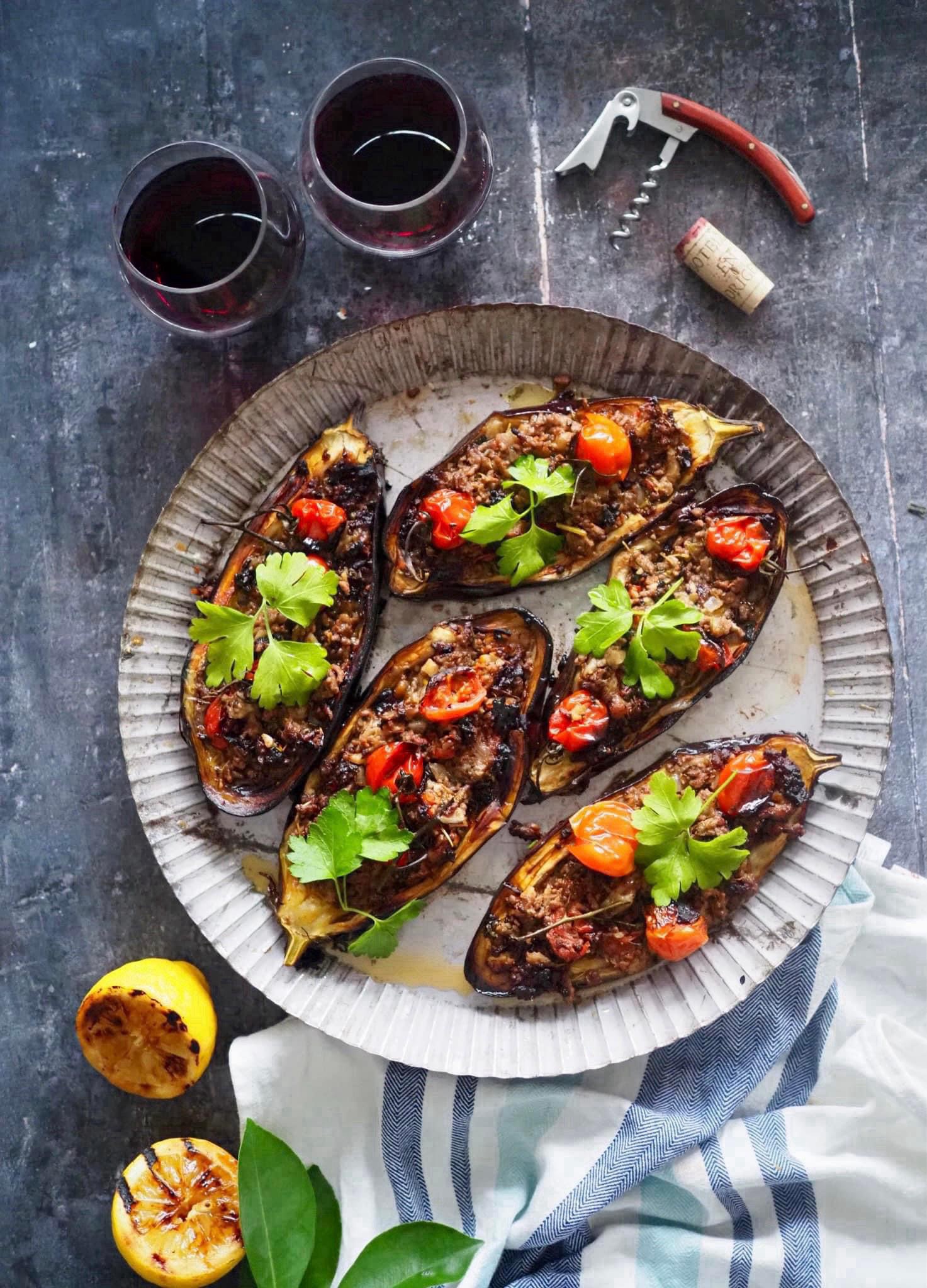 Nosta munakoisot uunista ja täytä jauhelihatäytteellä. Pane pinnalle puolitettuja kirsikkatomaatteja ja lorauta päälle hyvää oliiviöljyä.