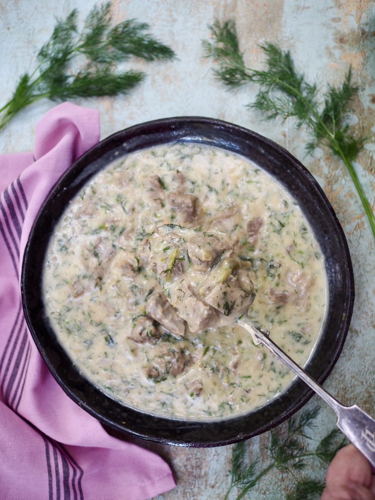 Sulata voi kattilassa ja lisää rasvan joukkoon vehnäjauhot. Sekoita hyvin. Lisää kuumaa keitinlientä vähitellen, koko ajan sekoittaen kunnes kastike sakenee. Anna kastikkeen kypsyä miedolla lämmöllä vartin verran. Mausta kastike sokerilla, etikalla ja tillillä. Lorauta kastikkeeseen tilkka kermaa. Kermaa ei välttämättä ole ruoassa perinteisesti käytetty, mutta se tasapainoittaa kauniisti kastikkeen makua. Tarkista suola.